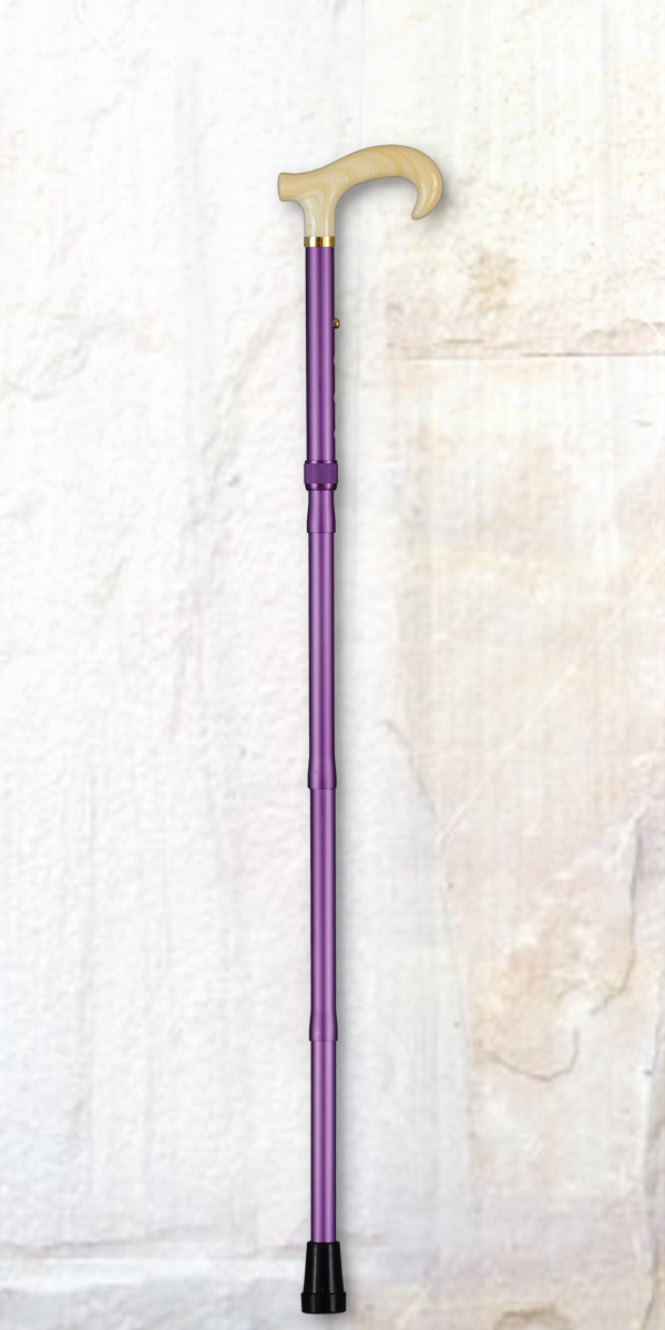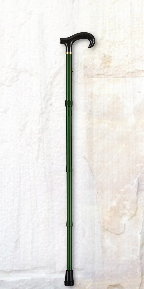 瀬川商店オリジナル、完全日本製のアルミ製ステッキです。4段折り畳み式で、4段階に長さの調節ができます。新潟県のアルミパイプ工場、千葉県のメッキ工場、東京下町の三脚工場で加工を行い、大阪府の樹脂成型工場でハンドルを製造。瀬川商店で組み立てました。本体カラーは5色、樹脂製手元は木目調の塗装仕上げです。|本体カラー全5色|